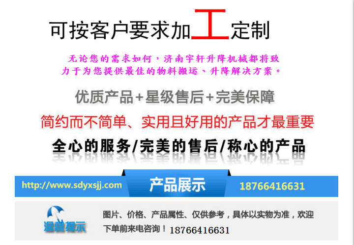 升降(jiàng)機www.netlk.com是一種用於起升貨物的液壓升降設備,采用液壓油缸作為動力傳(chuán)輸的重要鏈條和鋼絲繩,確保機器運行的絕對安(ān)全。無坑和機房,特別適用於地下(xià)室,倉(cāng)庫改造,新型貨架等,安裝維修方便,美觀,安全,操(cāo)作(zuò)方便。根據實際現場環境具體生產。