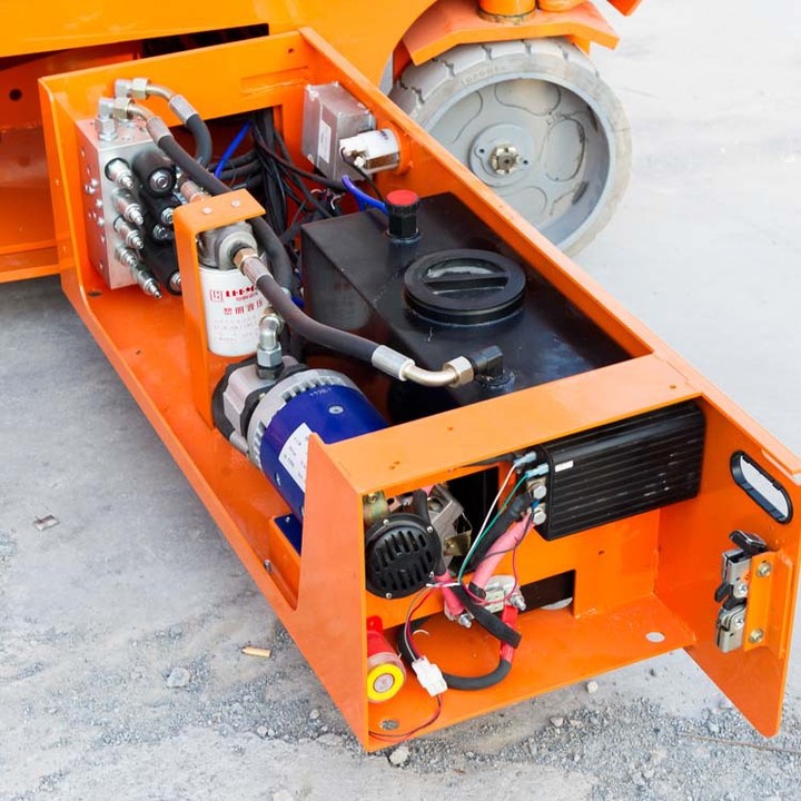整車采用進口液壓元器件,配置防爆管裝置、緊急下降裝置,行走通過液壓驅動來實現,低(dī)噪聲,無空氣汙染;選用耐用、不易刮傷地麵、不易粘碎屑、防滑的無痕輪胎;在保證安全可靠的前提下優化產品控製模式和控製(zhì)程序,操作更人性化。