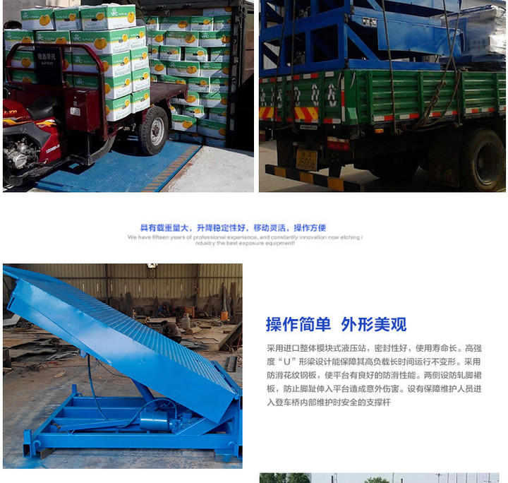 1.電控操(cāo)作隻(zhī)需按動按鈕,調節(jiē)板會自動升起,操作極(jí)其簡單;鬆開按(àn)鈕,調節板靠自重下降(jiàng),活頁搭(dā)板搭在貨車上即(jí)可使用。