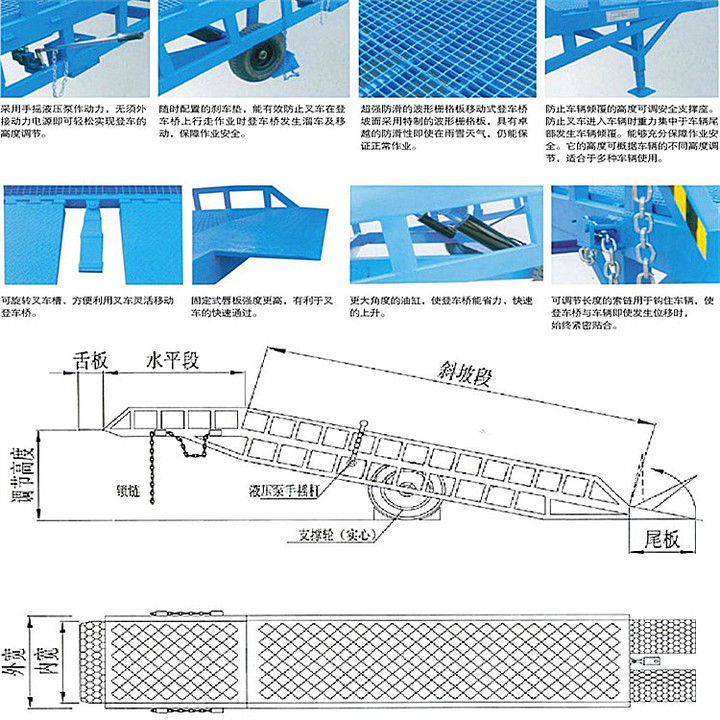 功能:方便卸貨(huò),穩定性強,維修成本低。適用於裝卸場(chǎng)地上各種車輛以及交通(tōng)相對繁忙的場(chǎng)所。