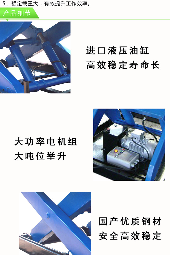 4、固定(dìng)式升降機(jī)采用防夾剪叉設(shè)計(jì),防(fáng)止(zhǐ)夾傷(shāng),帶有過載保護功能,更可靠(kào)、更安全設(shè)有防護裝置,超載(zǎi)安全保護的液壓係統,保障運行安全。